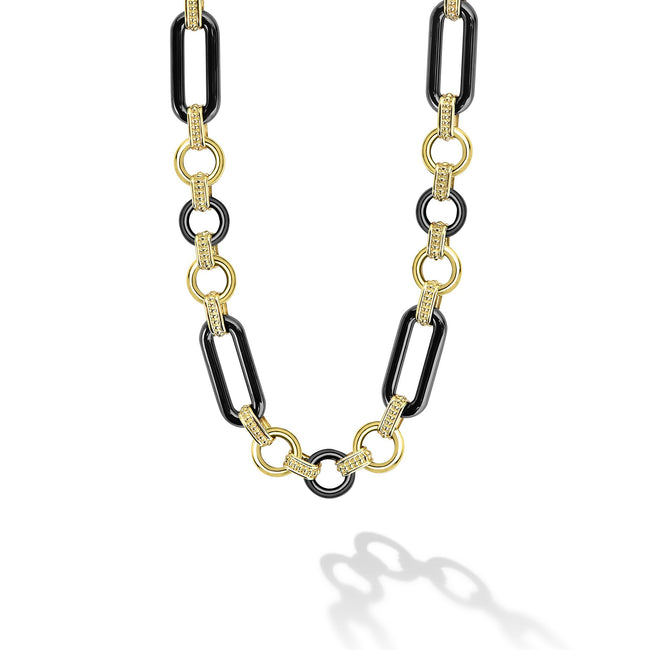 This tassel link necklace features black ceramic hoops linked together by 18K gold, cascading down to a tassel of 18K Caviar Gold.