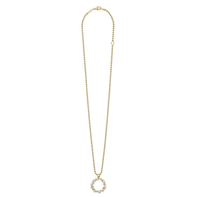 Brilliant bezel-set diamonds set in 18K gold form a circle and are finished on a chain. This pendant adds just the right amount of sparkle for everyday wear. LAGOS diamonds are the highest quality natural stones.