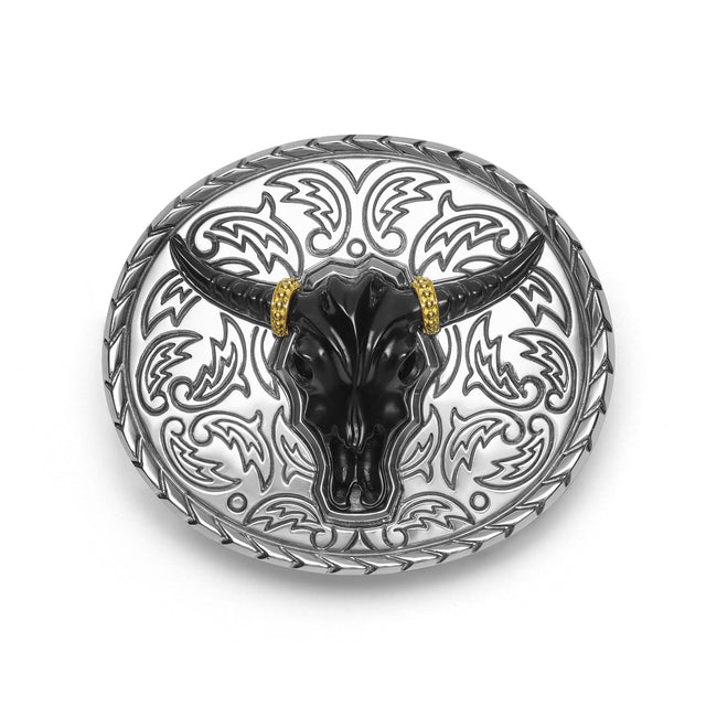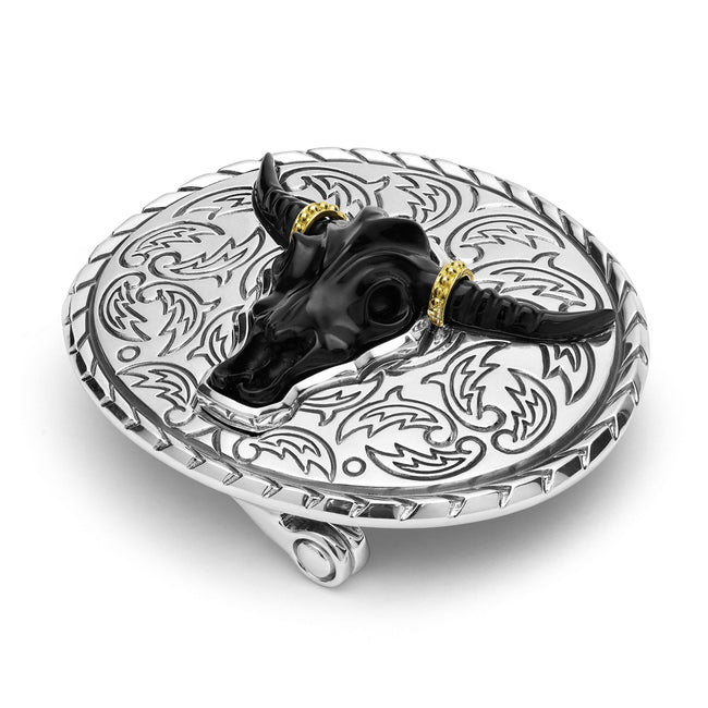 Intricately crafted black agate and 18K gold details surrounded by sterling silver form this bull motif belt buckle.