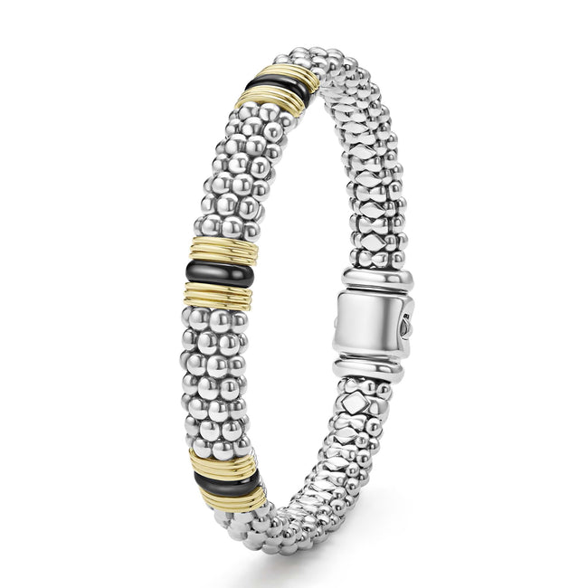 Smooth black ceramic and fluted 18K gold stations detail our classic sterling silver Caviar beading to form this bracelet.
