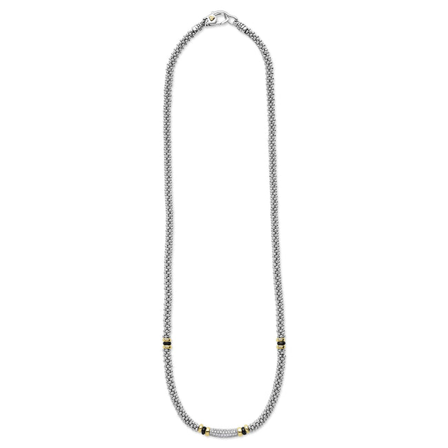 Diamonds surrounded by smooth black ceramic and 18K gold stations form this classic sterling silver Caviar beaded necklace. LAGOS diamonds are the highest quality natural stone
