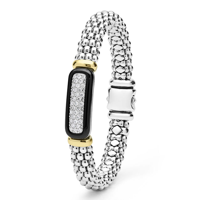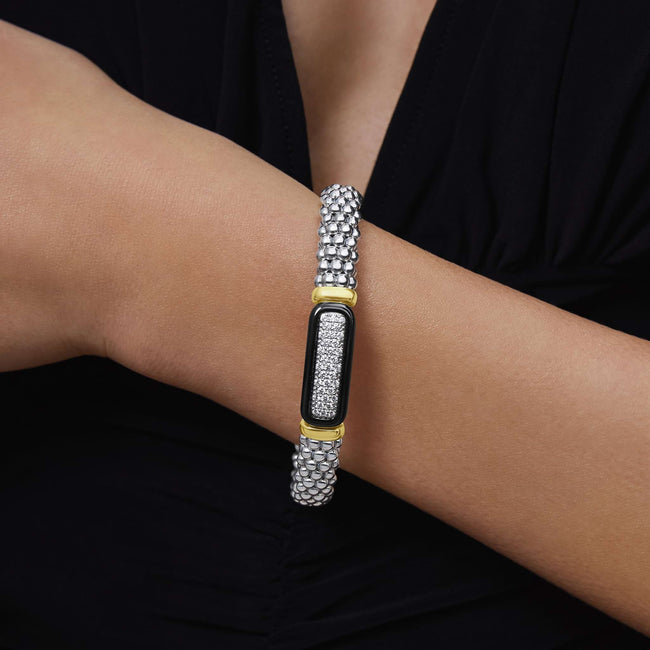 Diamonds surrounded by smooth black ceramic, 18K gold, and our classic sterling silver Caviar beading form this bracelet. LAGOS diamonds are the highest quality natural stones.