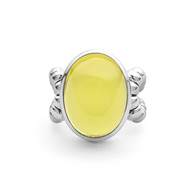 A smooth green quartz cabochon set in polished sterling silver and Caviar beaded detail form this statement ring. Its soft glow adds effortless elegance to any look.