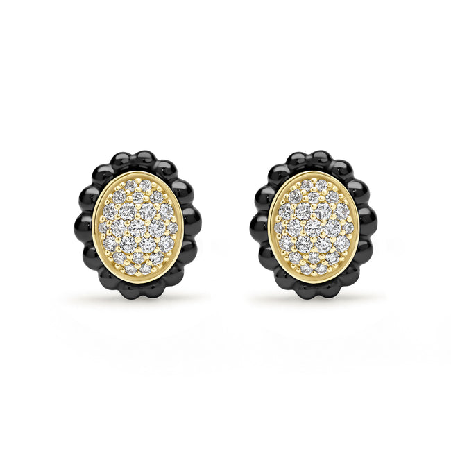 Brilliant pavé diamonds framed in radiant 18K gold and surrounded by Caviar beaded black ceramic form these stud earrings. The oval silhouette is both modern and timeless, making them an essential for every jewelry collection.