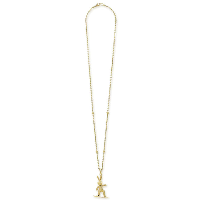 Artfully crafted 18K gold Caviar beaded snowboarding rabbit pendant is finished on a versatile 18K gold chain necklace.