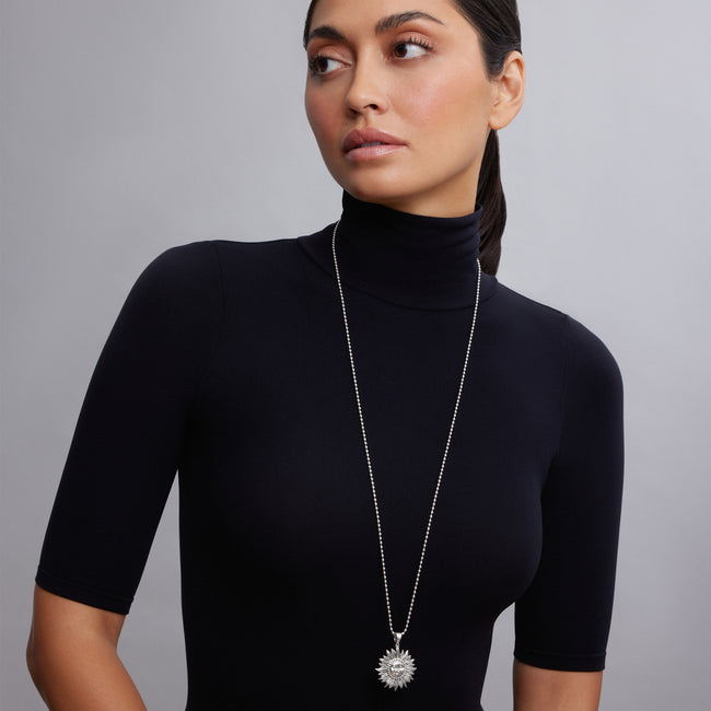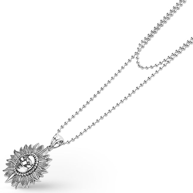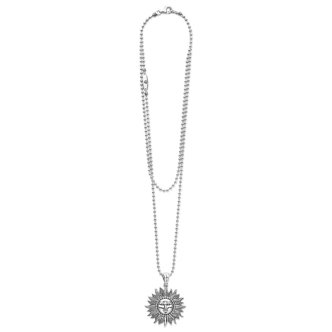 A sterling silver Caviar beaded sun pendant with fluted sterling silver accents forms this pendant finished on a versatile ball chain necklace.