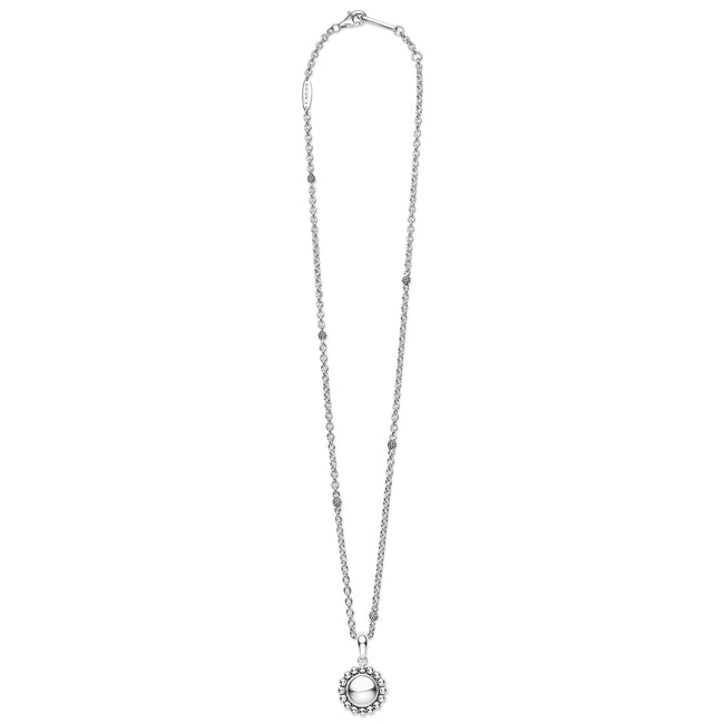 Caviar beading frames smooth sterling silver to form this circle pendant, finished on a fine chain for a classic, timeless style.