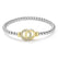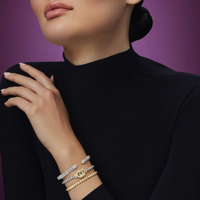 18K gold and diamond interlocking rings finished on a sterling silver stretch bracelet. LAGOS diamonds are the highest quality natural stones.